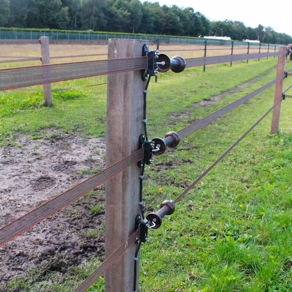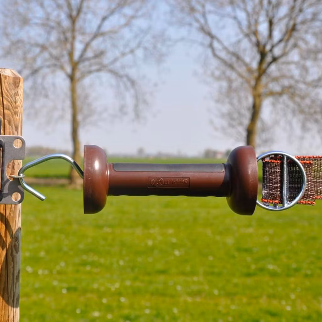 Gallagher Soft Touch ledhåndtag til bånd i Terra farve er udviklet til sikre og brugervenlige låger i elhegn. Håndtaget er beregnet til elbånd op til 40 mm og kombinerer høj styrke med et blødt gummigreb, som ligger stabilt i hånden selv i regnvejr. Terra farven falder naturligt ind i omgivelserne og giver et mere diskret hegnsudtryk.