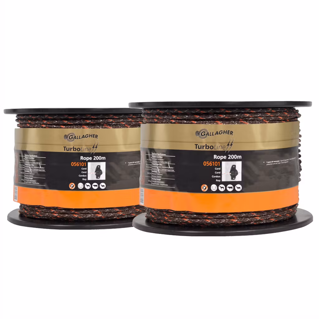 Gallagher TurboLine Duopack indeholder 2x200 m flettet elreb med Soft-Touch-teknologi, som reducerer stræk og forlænger levetiden med op til 30%. Med 8 rustfri tråde kombineret med 3 fortinnede kobbertråde opnås 20% bedre ledningsevne end standardreb. Den diskrete terra-brune farve gør, at hegnet smelter naturligt ind i landskabet, hvilket gør det ideelt til både heste, kvæg og vildt.