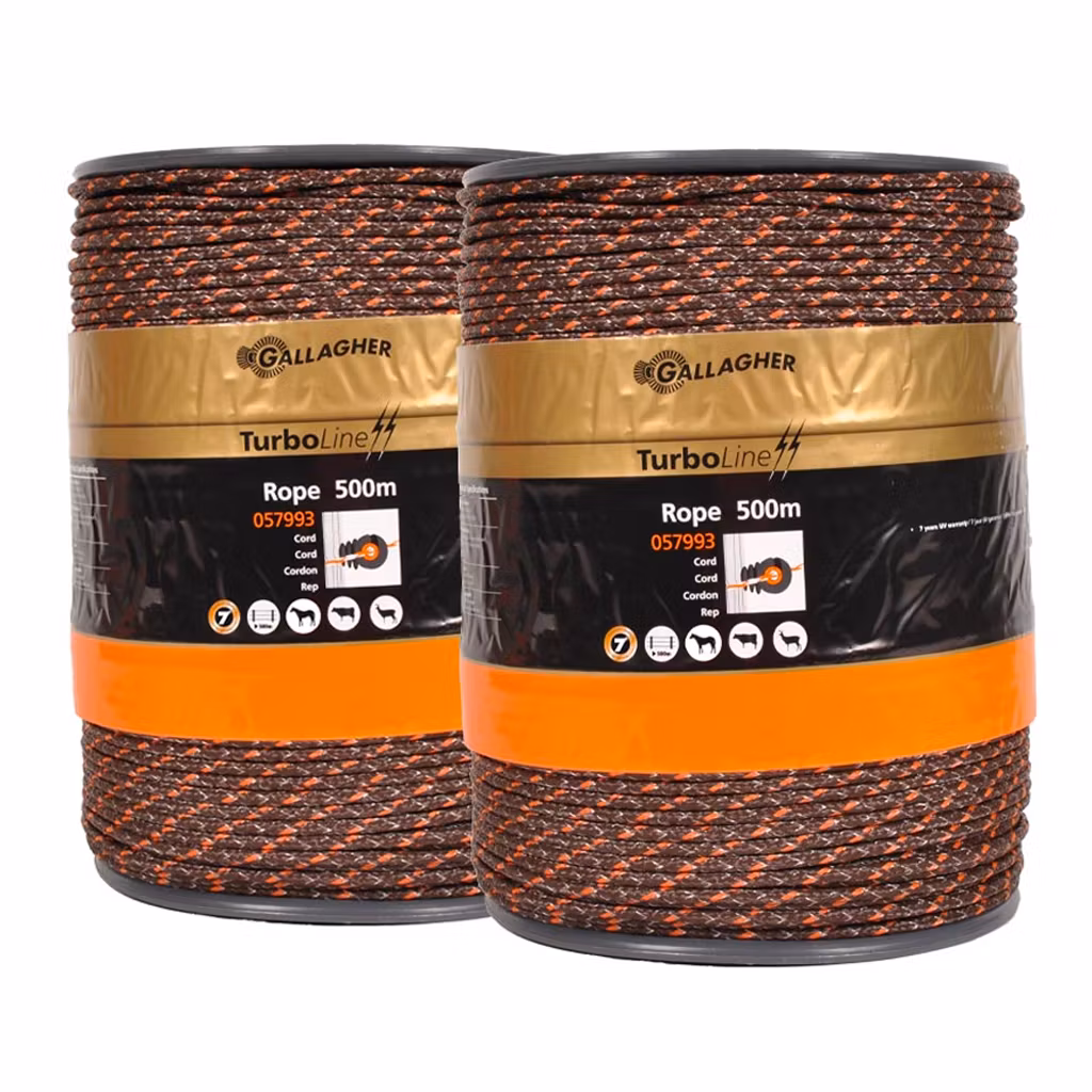 Gallagher TurboLine Duopack i terra indeholder 2x500 m flettet elreb, designet til lange hegn med maksimal holdbarhed. Med Soft-Touch teknologi reduceres strækningen, hvilket giver høj dyresikkerhed og op til 30% længere levetid. Rebet kombinerer 8 rustfri ståltråde med 3 fortinnede kobbertråde og leverer 20% bedre ledningsevne end standardreb. Den brune terra-farve sikrer, at hegnet falder naturligt ind i landskabet.