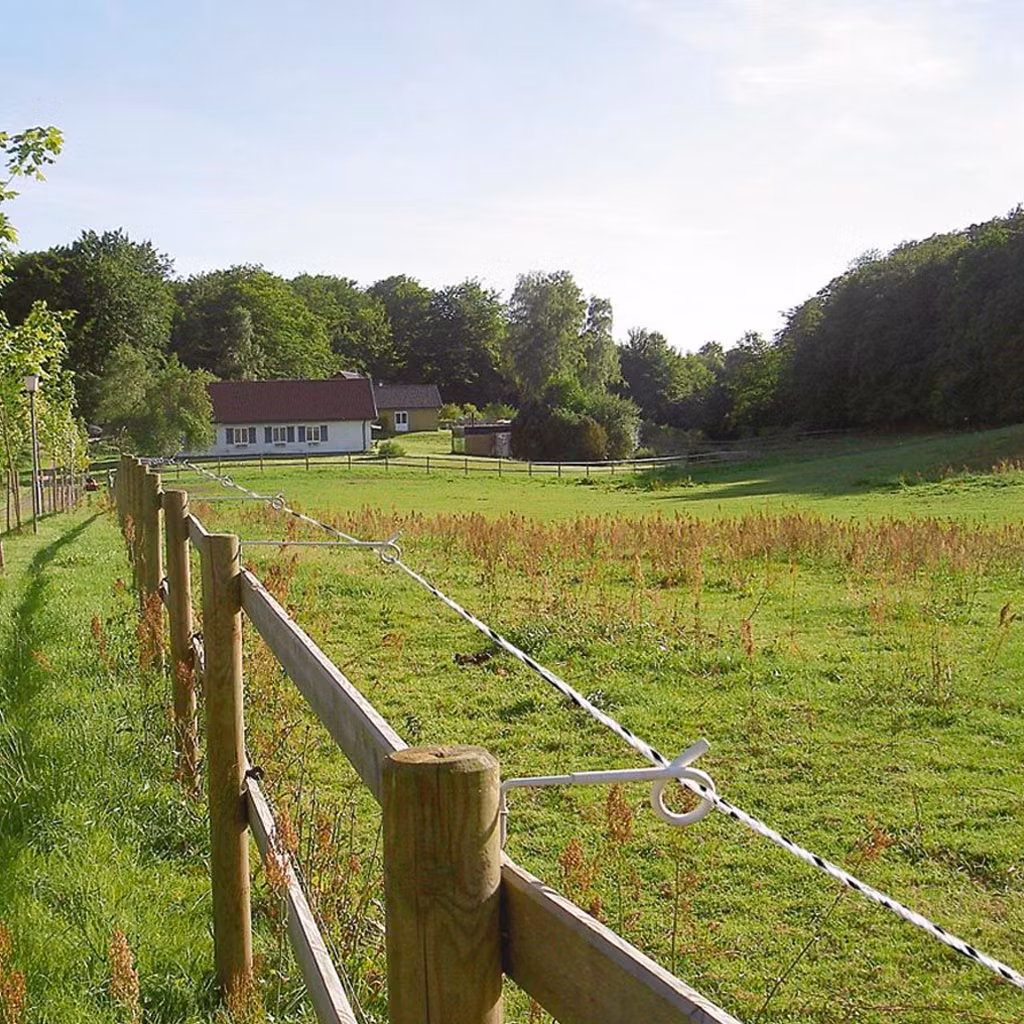 Med 5 rustfri ståltråde leverer det stabil strømledning, og takket være UV-stabilisering holder rebet længere selv i stærkt sollys. Den høje trækstyrke på 330 kg giver ekstra holdbarhed i daglig brug, og stolpeafstand på op til 8 meter gør det let at opsætte.