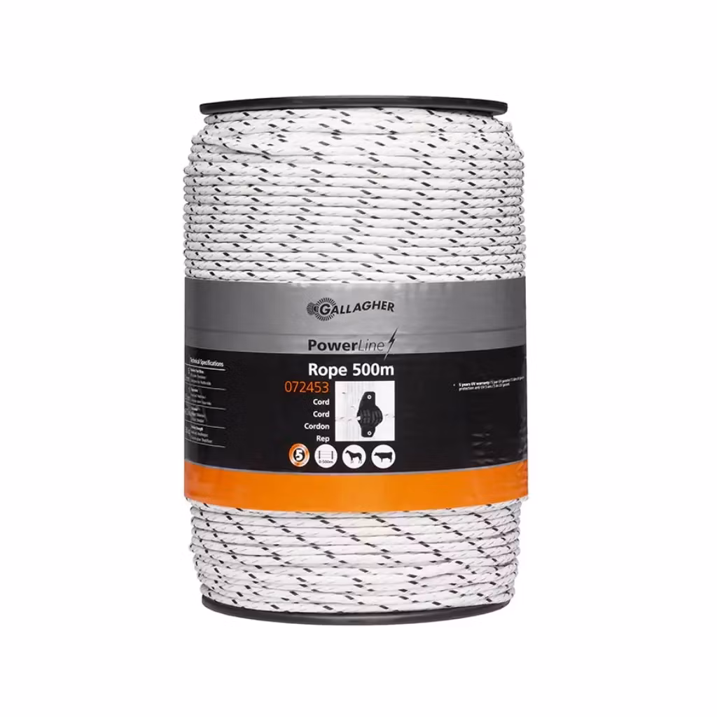 Gallagher PowerLine elreb hvid 500m. UV-beskyttet, stærkt og synligt elreb til heste- og kreaturhegn. Køb online hos Farmab.dk.