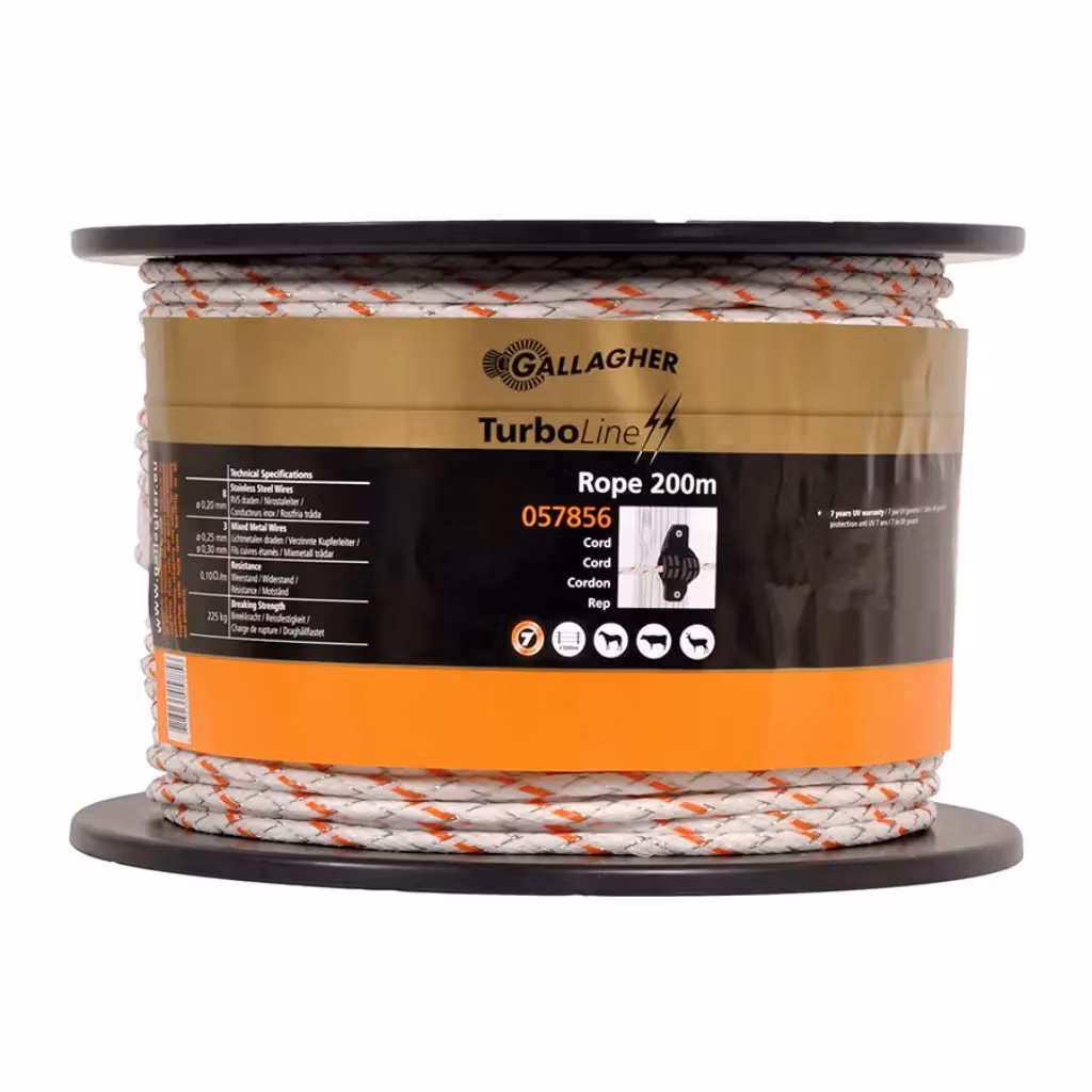 Gallagher TurboLine elreb i hvid er designet til lange, sikre og holdbare hegn. Med 8 rustfri tråde og 3 fortinnede kobbertråde har rebet 20% bedre ledningsevne end standardreb. Soft-Touch teknologien forhindrer unødigt stræk, øger dyresikkerheden og giver op til 30% længere levetid. Den hvide farve med brune og orange detaljer sikrer høj synlighed – perfekt til heste, kvæg og vildt.