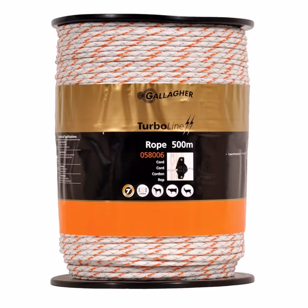 Gallagher TurboLine elrep i hvid er et premiumvalg til halvpermanente hegn, der kræver ekstra sikkerhed og pålidelighed. Det flættede Soft-Touch design forhindrer udstrækning og giver længere levetid. Med 8 rustfri ståltråde og 3 fortinnede kobbertråde leverer rebet 20% bedre ledningsevne end standard elreb. Ideelt til hegn op til 500 m, hvor høj synlighed og maksimal sikkerhed for dyrene er afgørende.