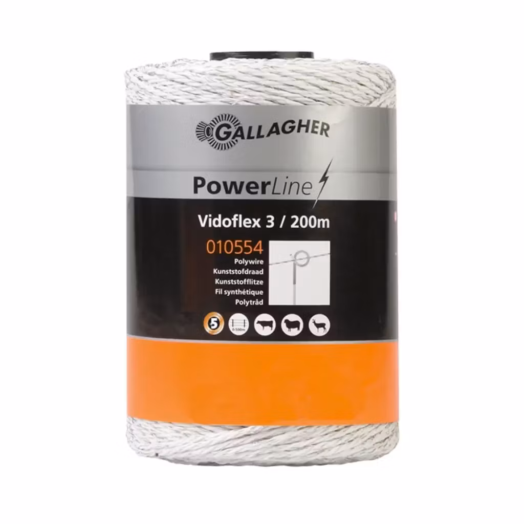 Gallagher Vidoflex 3 PowerLine 200 m er en robust polytråd til midlertidige hegn under 500 m. Med 6 rustfri ledere sikrer den stabil strømføring og pålidelig drift. Den hvide farve giver ekstra synlighed for både dyr og mennesker, mens UV-beskyttelsen forlænger trådens levetid. Ideel til kvæg, får, husdyr og vildt.