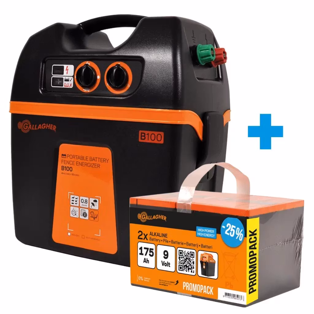 Gallagher B100 är ett kraftfullt batteriaggregat för 9 V och 12 V batteri. Enkel att flytta och lämpligt för stängsel upp till 10 km.