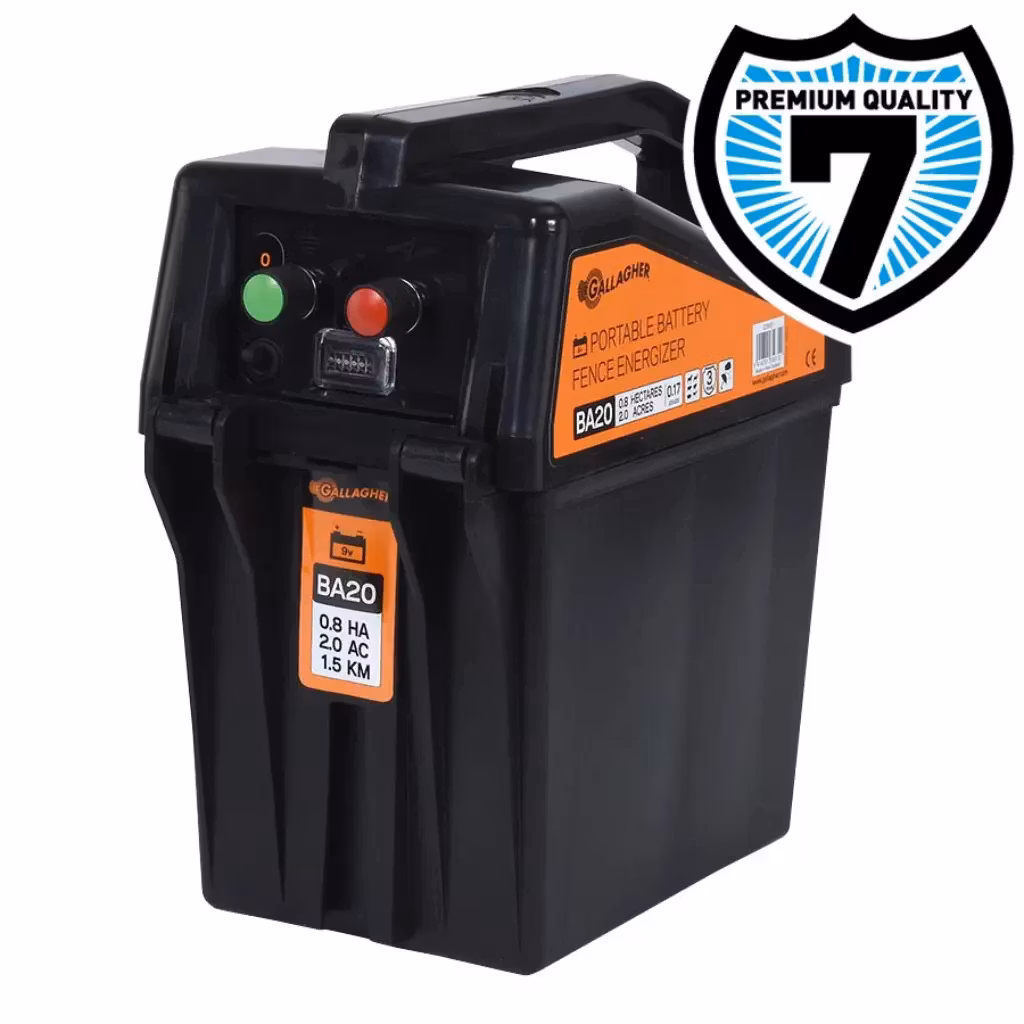 BA20 är Gallaghers minsta batteridrivna aggregat och det är lämpligt för korta stängsel som inte är längre än 2 km. Aggregatet är lätt och enkelt att flytta vilket gör att BA20 passar utmärkt för mobila stängsel. Aggregatet har ett inbyggt skydd mot blixtnedslag och det levereras med anslutningskabel. Exklusive batteri.