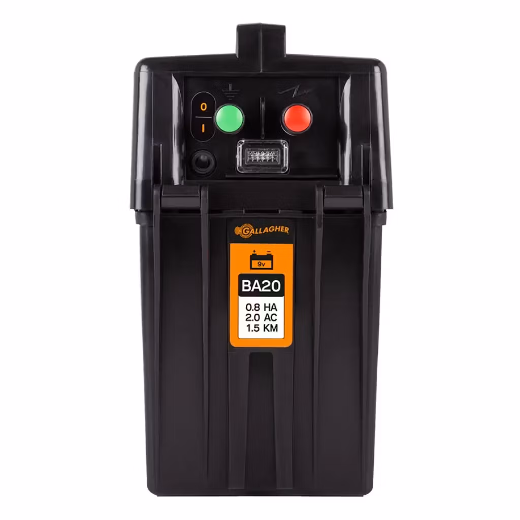 BA20 är Gallaghers minsta batteridrivna aggregat och är lämpligt för korta stängsel som inte är längre än 2 km. Aggregatet är lätt och enkelt att flytta