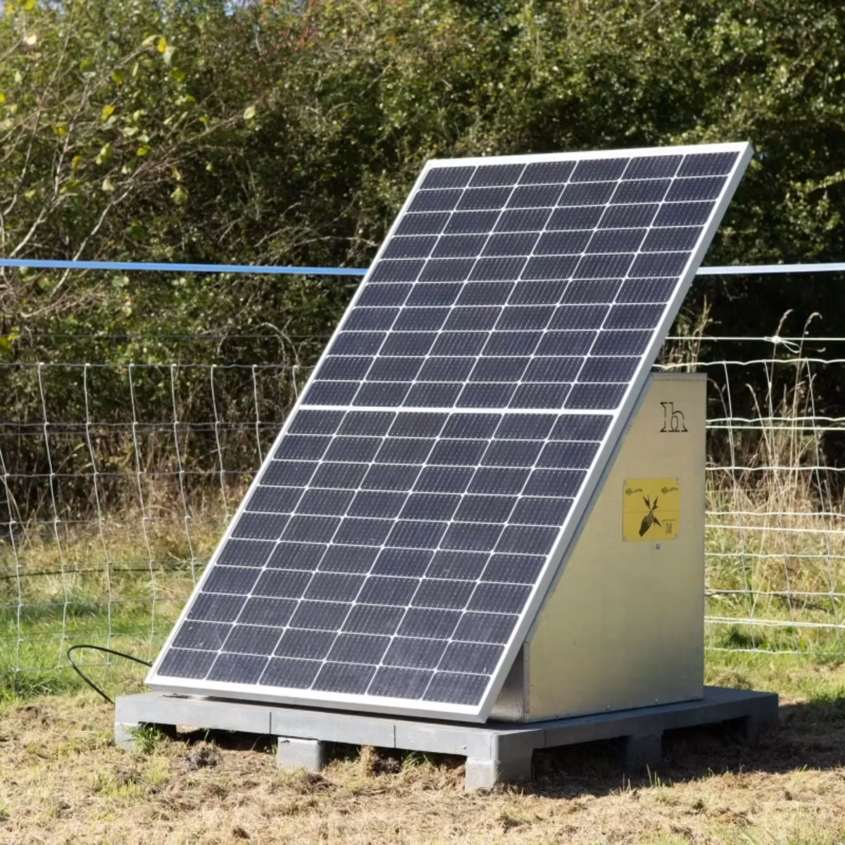 Tyverisikret solcelleanlæg 14J med 370W panel og 2x120Ah batterier. Til hegn op til 17 km. Appstyret og komplet med jordingskit.