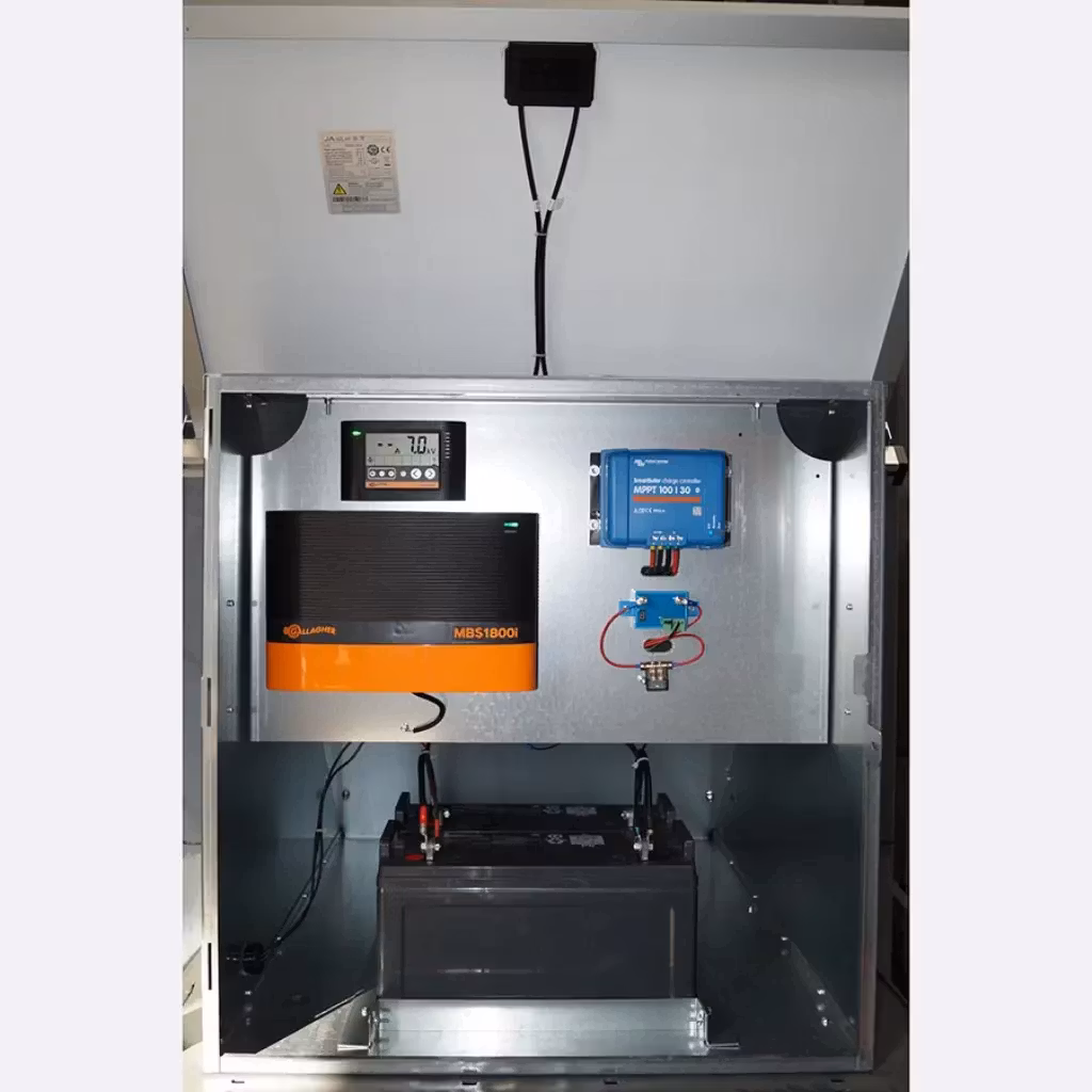 Kraftfullt soldriven strömstation med elstängselaggregatet (MBS1800i) monterat i ett stöldsäkert skåp. Drivs med 2 gelbatteri och 325W solpanel. Allt ingår