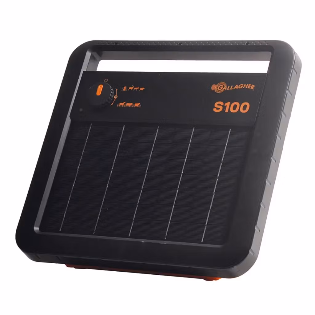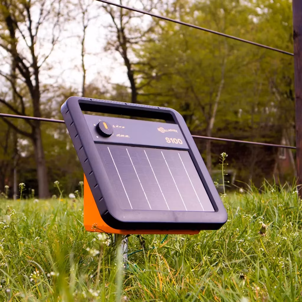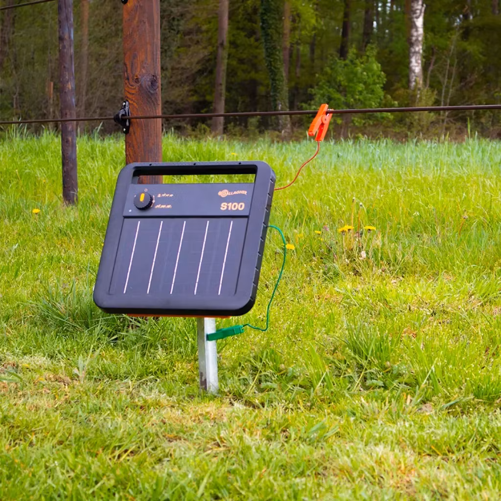 Med S100 kan du nu enkelt sätta upp ett stängsel på 10 km utan att du själv behöver ladda batteriet. Detta kraftfulla aggregat, som drivs med solenergi, går snabbt att installera och är enkelt att transportera. Inget mer krångel med tomma batterier. Med S100 har du ström även om solen inte skiner på 3 veckor!