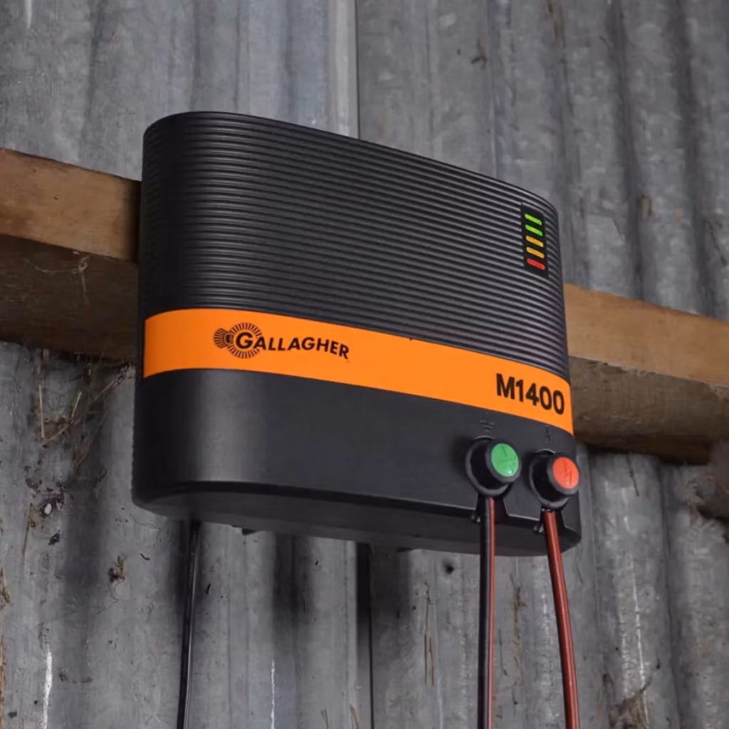 M1400 är ett robust elnätsaggregat som passar stängsel upp till 55 km. Aggregatet har ett inbyggt åskskydd och LED-lampor på framsidan, där stängslets spänning kan avläsas.