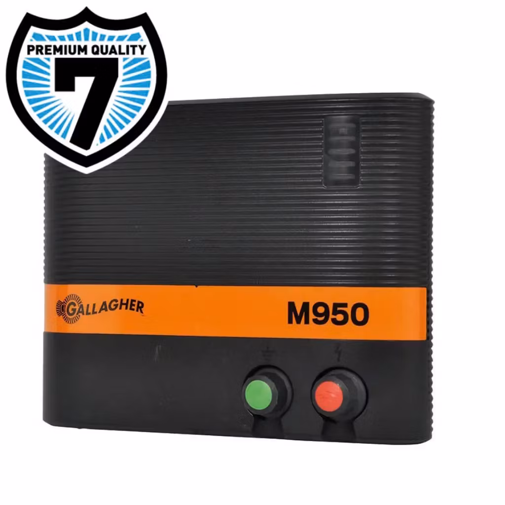 Gallagher M950 från Special Edition Range är ett kraftfullt elstängselaggregat som passar långa stängsel med flera trådar upp till 42 km. Aggregatet är enkelt att använda och underhållsfritt. Aggregatet har LED- lampor på framsidan som visar aggregatets prestanda. Det har även ett inbyggt åskskydd.
