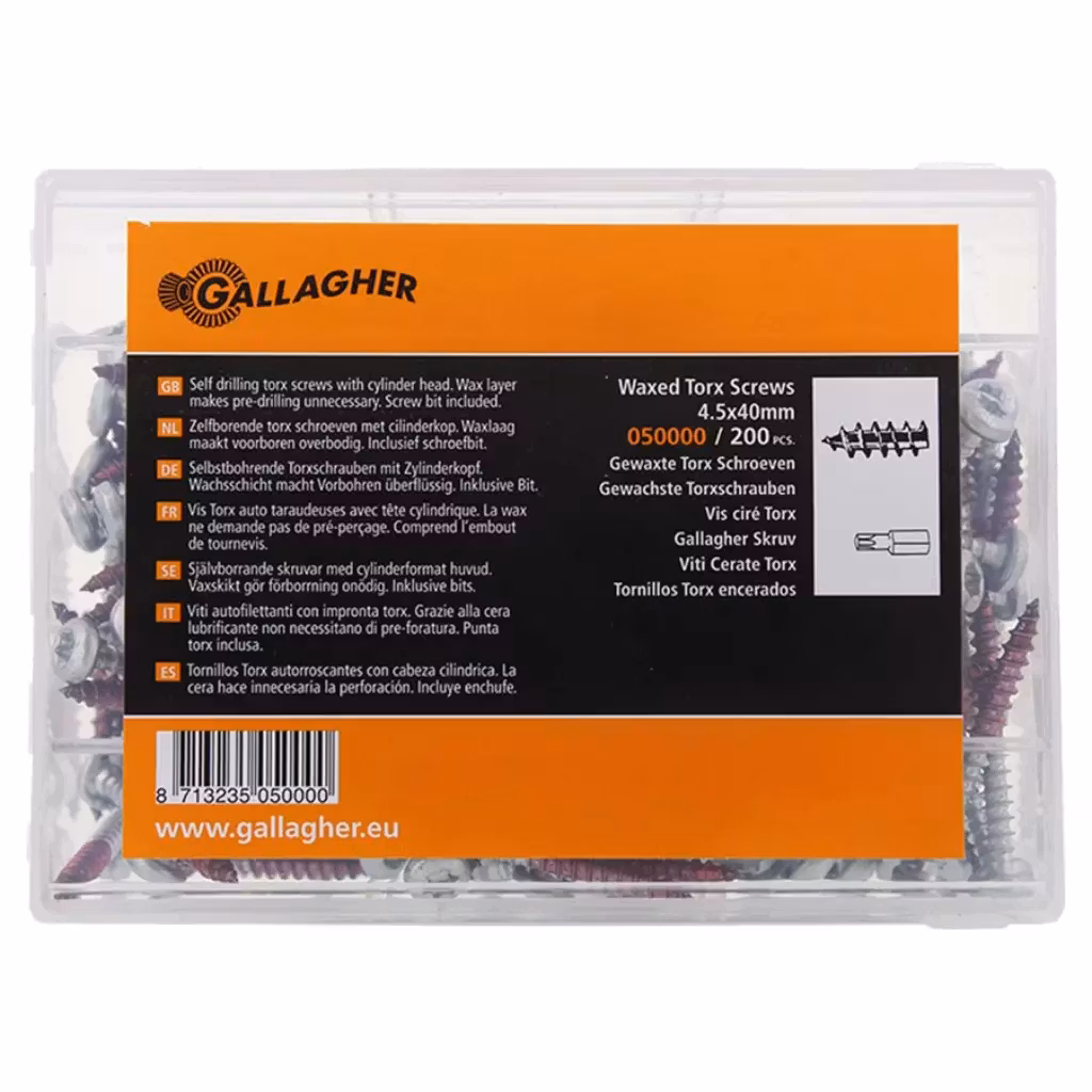 Gallagher skruer er udviklet til professionelt hegnsarbejde, hvor driftssikkerhed og effektiv montering er afgørende. Med selvborende funktion og præcis pasform minimeres arbejdstid, samtidig med at installationen bliver ensartet og holdbar.