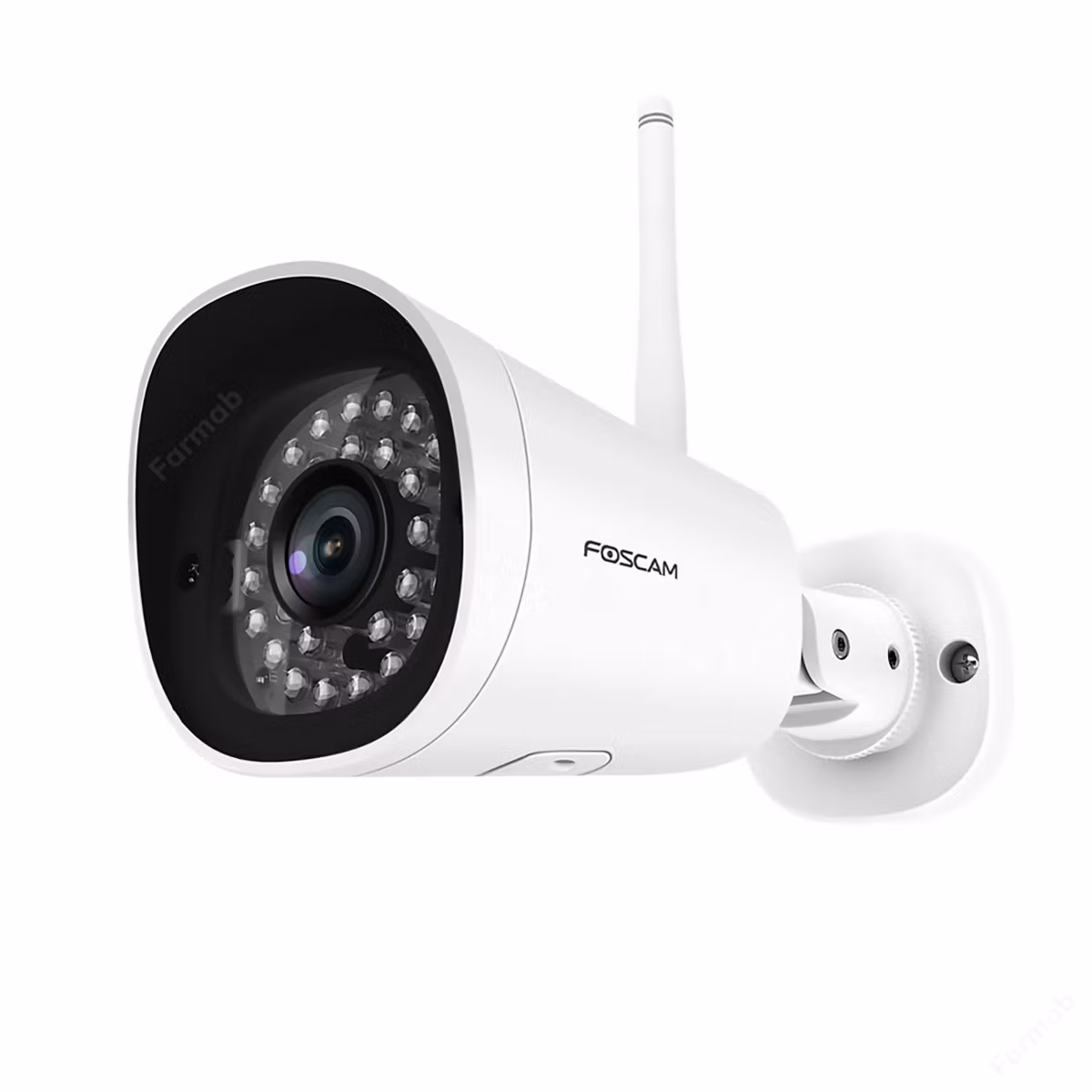Kameraet tilsluttes nemt via WiFi og giver direkte adgang til live-visning via Foscam appen på smartphone eller tablet. Det robuste og vejrbestandige design gør det velegnet til både indendørs og udendørs brug.