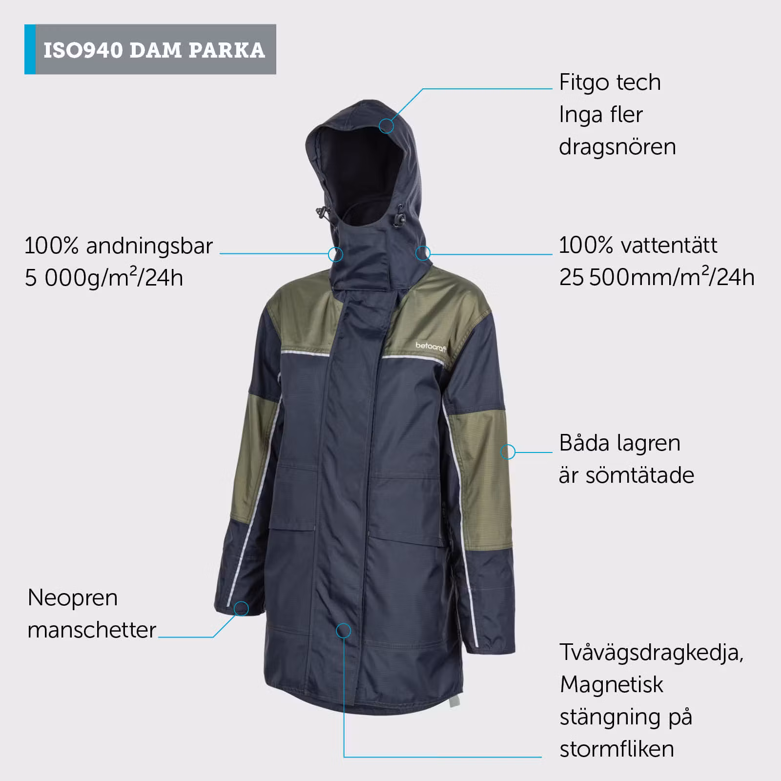 Betacraft ISO940 Dam Parka är en lättviktsjacka som erbjuder maximalt skydd och rörelsefrihet under alla väderförhållanden. Jackan är tillverkad av ett avancerat Tetratac 4-lagerssystem som är extremt slitstarkt, 100% vattentätt och mycket andningsbart. Detta gör att du alltid håller dig torr och bekväm.