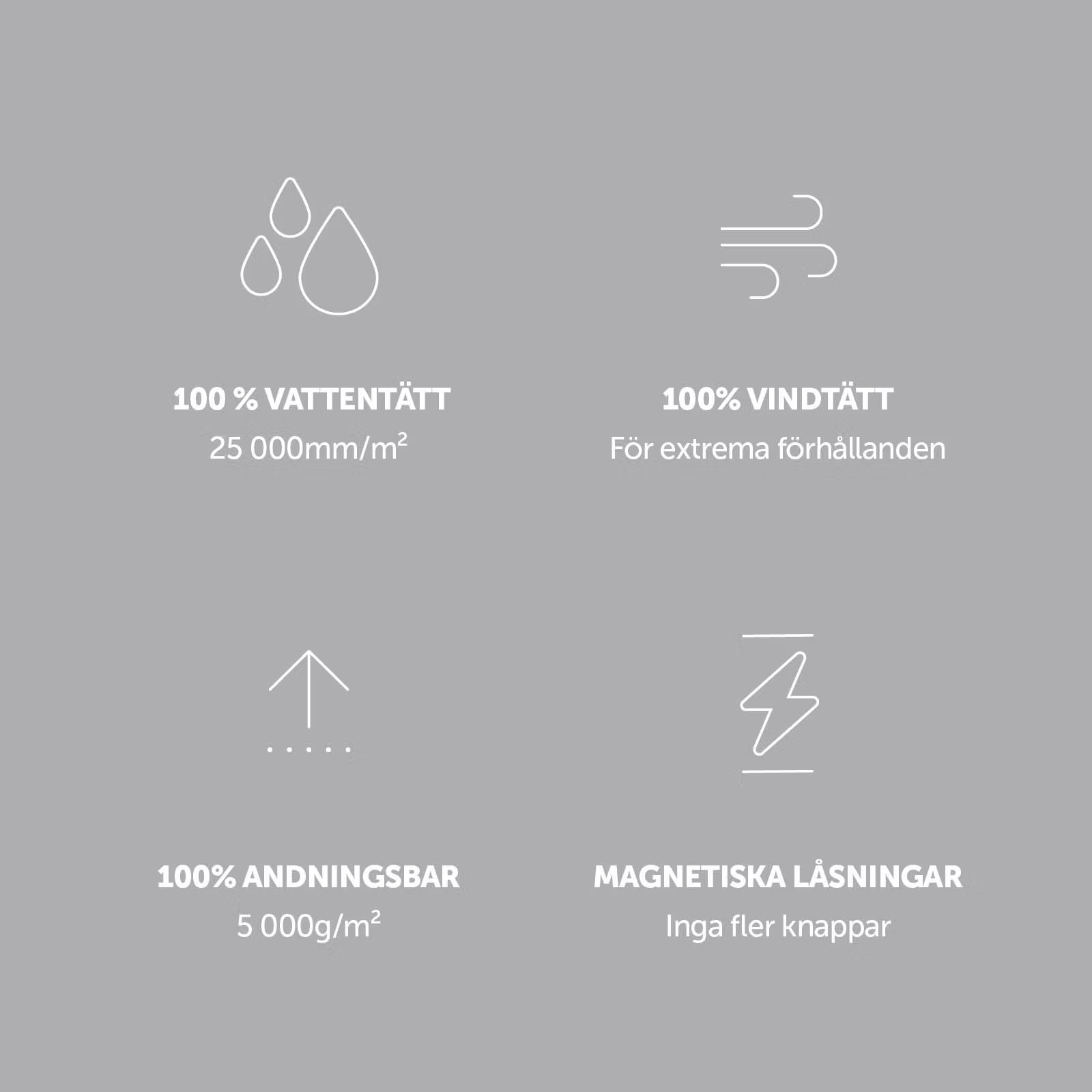 - Tvättråd: Tvätta i max 50°C utan tvättmedel, torktumla vid låg temperatur, undvik ångning, strykning eller blekning för att bibehålla vattentätheten.